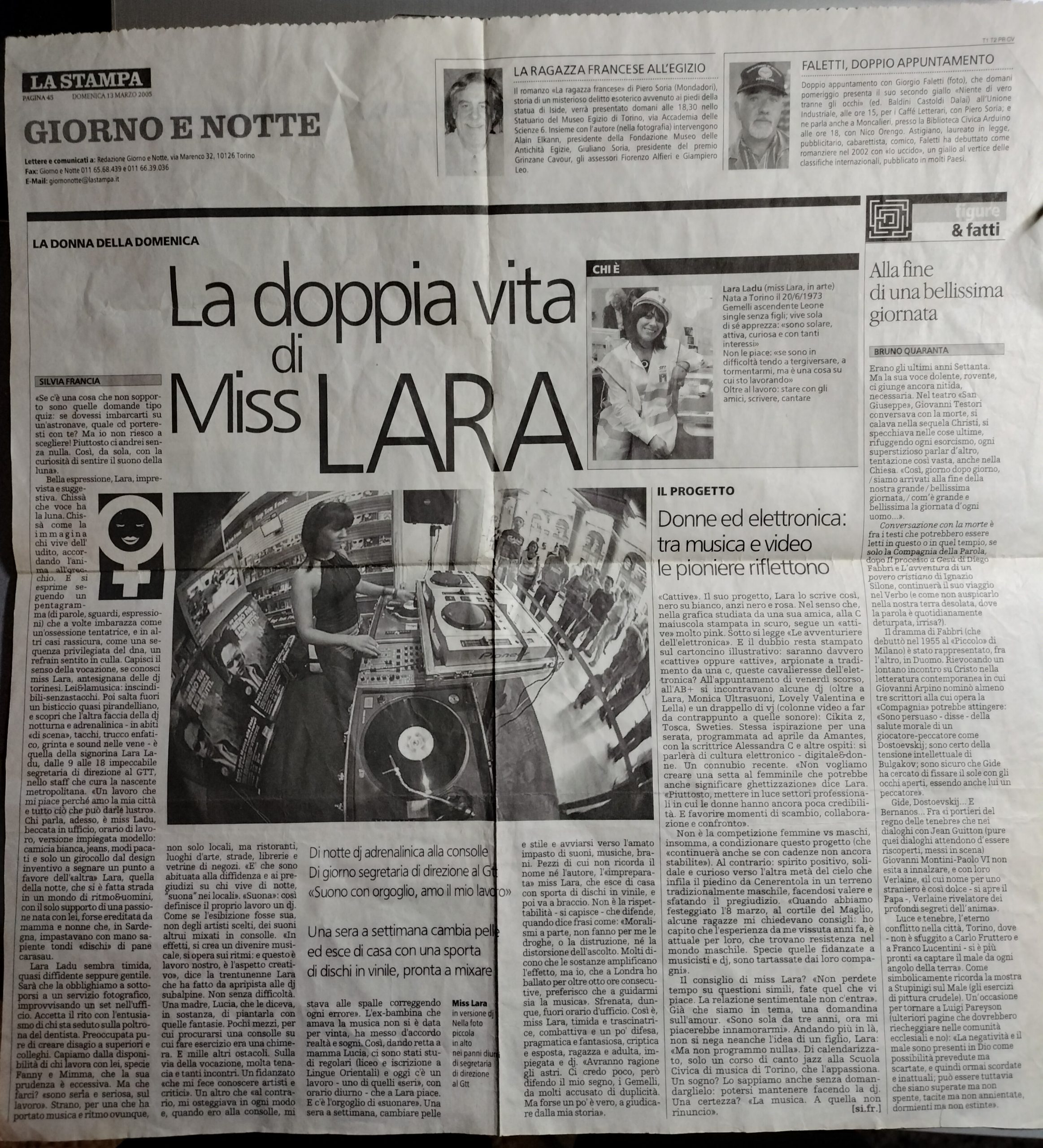 Con il nickname di Dj Miss Lara sono tra le prime donne dj a Torino negli anni ’90. Collaboro con i più importanti nomi e le più prestigiose realtà del clubbing torinese. Inizio mixando vinili con il celebre Technics 1200poi passare al digitale, creando dj set ecletticia base di colonne sonore, jazz, elettronica, d’n’b, 2step e house music e nuovi suoni, proponendo un sound ricercato.