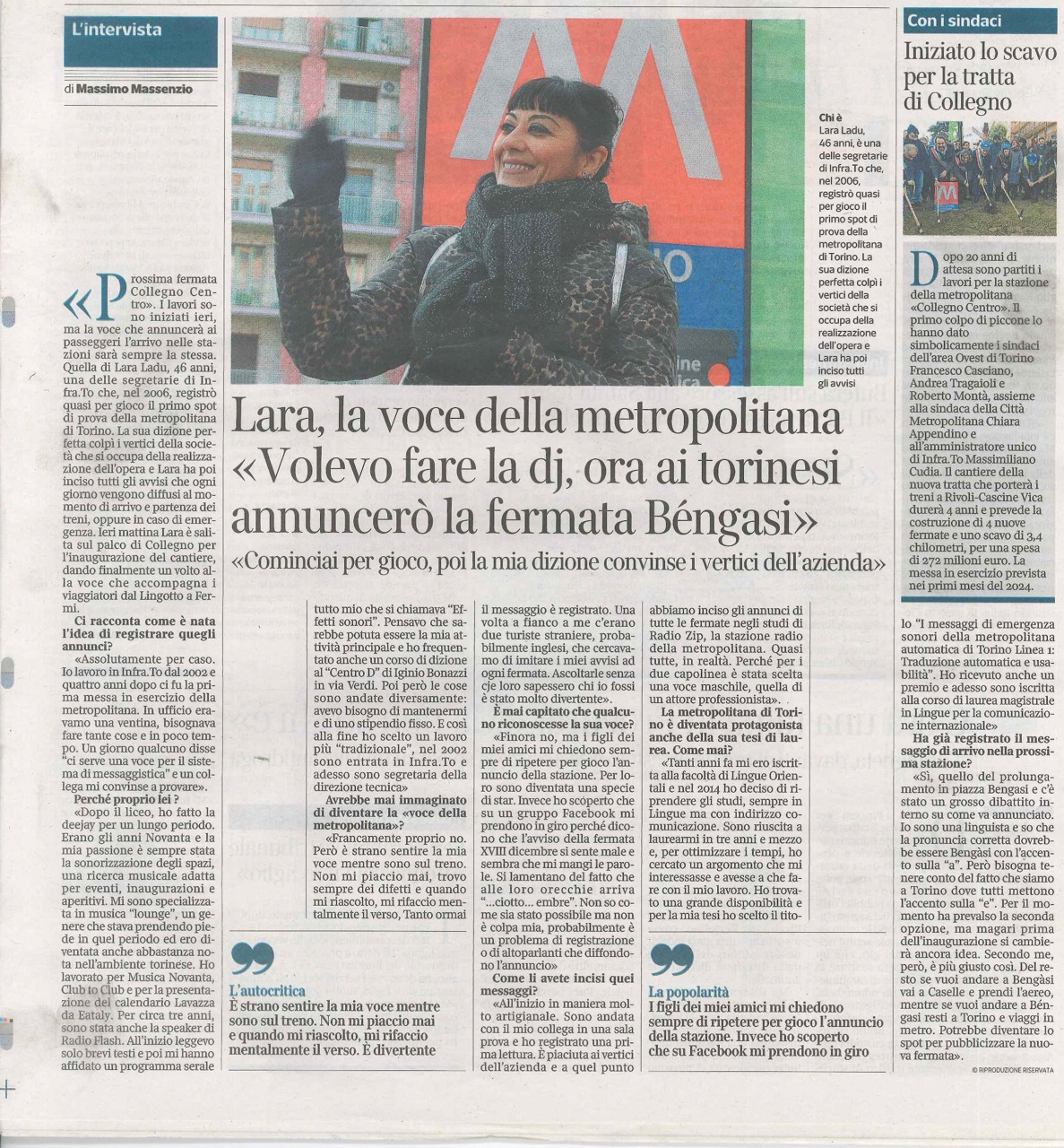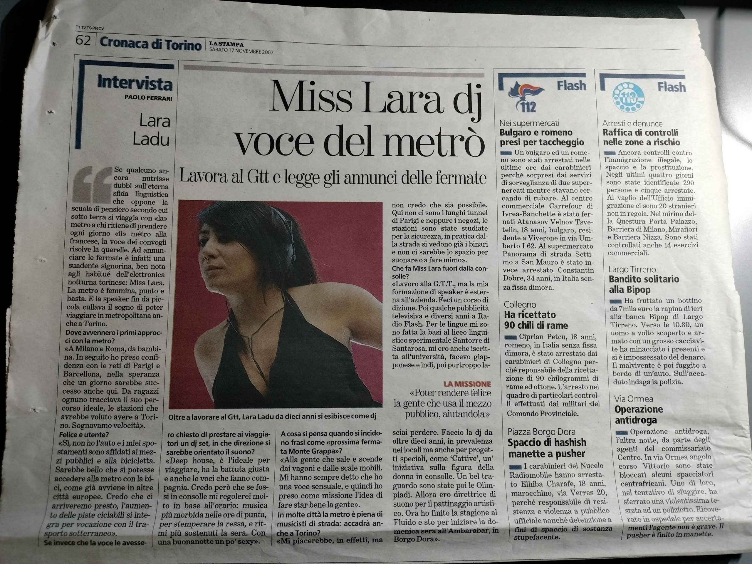 Nei primi anni 2000 entro nel mondo della costruzione della Metropolitana di Torino, un’opera simbolo di innovazione e modernità a lungo desiderata dai cittadini. Le competenze in dizione e fonetica e l’esperienza di speakeraggio radiofonico maturate al di fuori di quell’attività si rivelano risorse preziose per me. Così nel 2006, dopo anni di attività radiofonica e clubbing con il nome di Miss Lara, presto la voce per gli annunci delle fermate della prima metropolitana torinese, diventando così “La voce della Metropolitana di Torino”.